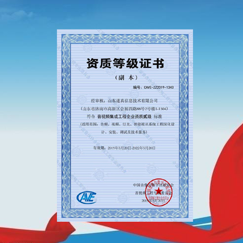 公司獲得中國(guó)音像協(xié)會(huì)音視頻工程專業(yè)委員會(huì)頒發(fā)的《音視頻集成工程企業(yè)資質(zhì)貳級(jí)》證書,成為省內(nèi)首批通過該權(quán)威機(jī)構(gòu)認(rèn)證的二級(jí)資質(zhì)企業(yè)。